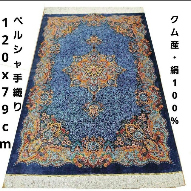 この絨毯は シルクで有名な産地クムのマットです。 ミンクのような肌触りと光沢もあります。 モチーフは幸運と善の意味で織り上げられてます。 詳細: ペルシャ絨毯 クム産地 絹100% 厚み約5ミリ。 カラー:濃紺ベース 天然草木染め 手染め しっかり織ってあります。 87x58cm(房除く) 丸められます たためます。 光沢もあり肌触りが良いです。 タペストリーとしても使えます。 ペルシャのシルクのじゅうたんです。 シルクの肌触りと玉虫色に変化する色合いが部屋の明るさと雰囲気をガラッと変えます。 玄関に、ベッドサイドに、パーソナルチェア、タペストリーとして使います。 アフターもOKなので安心して購入下さい。