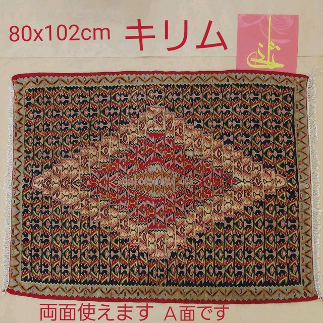 ★ワンポイントレッスン★ キリムは遊牧民たちによって生み出され生活必需品として受け継がれてきた実用的な織物です。じゅうたんより歴史が古く、そこに描き出された独特な模様や色の深い意味があり、一枚一枚キリムも異なります。 このキリムに使われているモチーフは ★花★乾燥した高原に住む遊牧民にとって庭園楽園です。 ★目★魔除けのモチーフです ★生命の木★樹木は不減の繁栄、永遠の命などを表す。 ペルシャじゅうたん・キリムを少し知っとくと使うのも楽しくなりますよ。 ペルシャ手織りキリム 夏も冬も一年中使えます。 約82x141センチ(房除く) 羊毛100% 手染め、天然色 厚み約6ミリ たためます。 裏と表あります。 タタミジワありますが、敷いたらのびます¥248.400で販売してました。 ペルシャ手織りでジャジム織りの技法で仕上げた家庭用のキリムです。 しっかり織りですのでキリムにはりがあり、ムダ毛などがでないのが特徴です。 また素朴な環境で織り上げられるもので、ゆがみ、いろむらに手織りの温かみが感じます。 さりげなく置かれますと、和洋どちらにもよく似合います。
