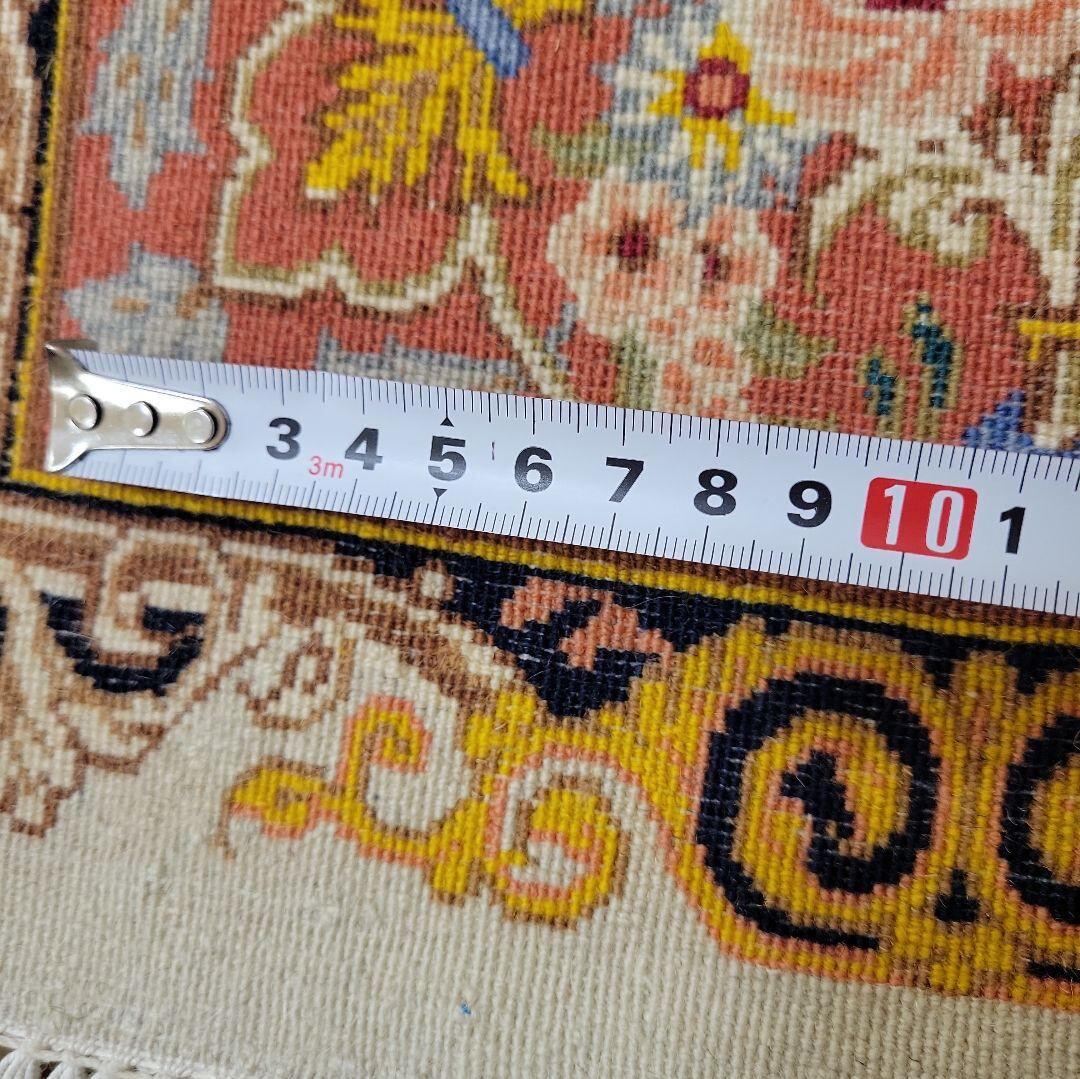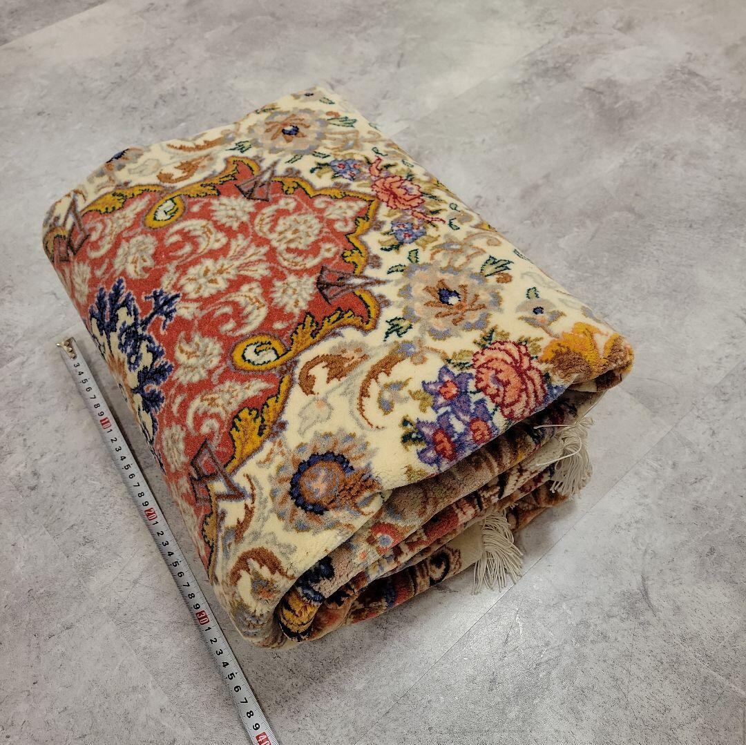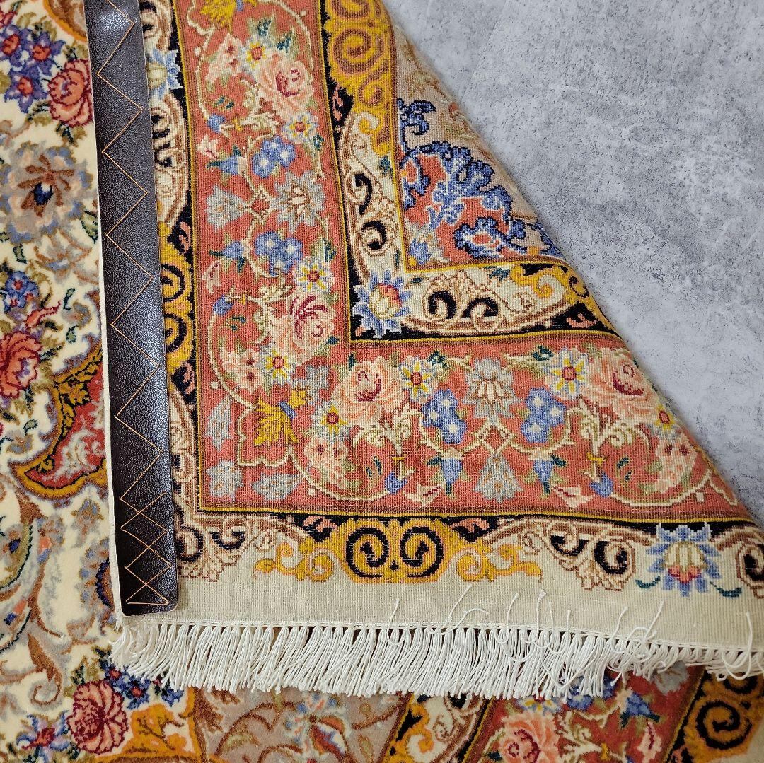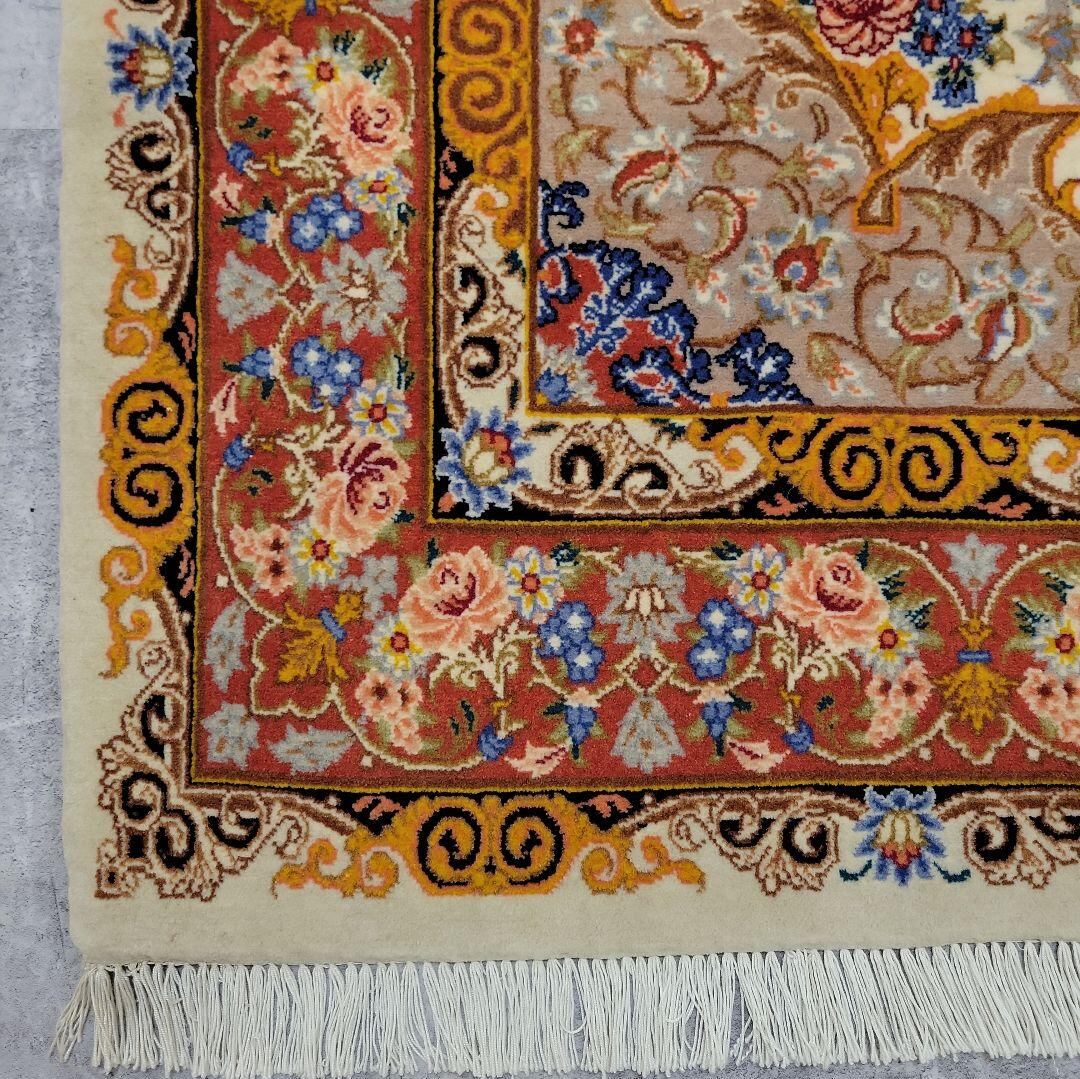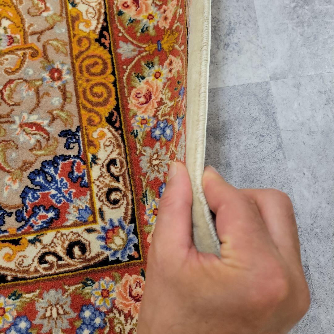 この絨毯はシルクじゅうたんで有名産地クムで作られた物ですがシルクではなくコルクウール100%で作られた数少ない物です。