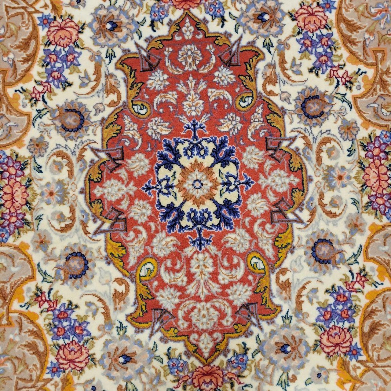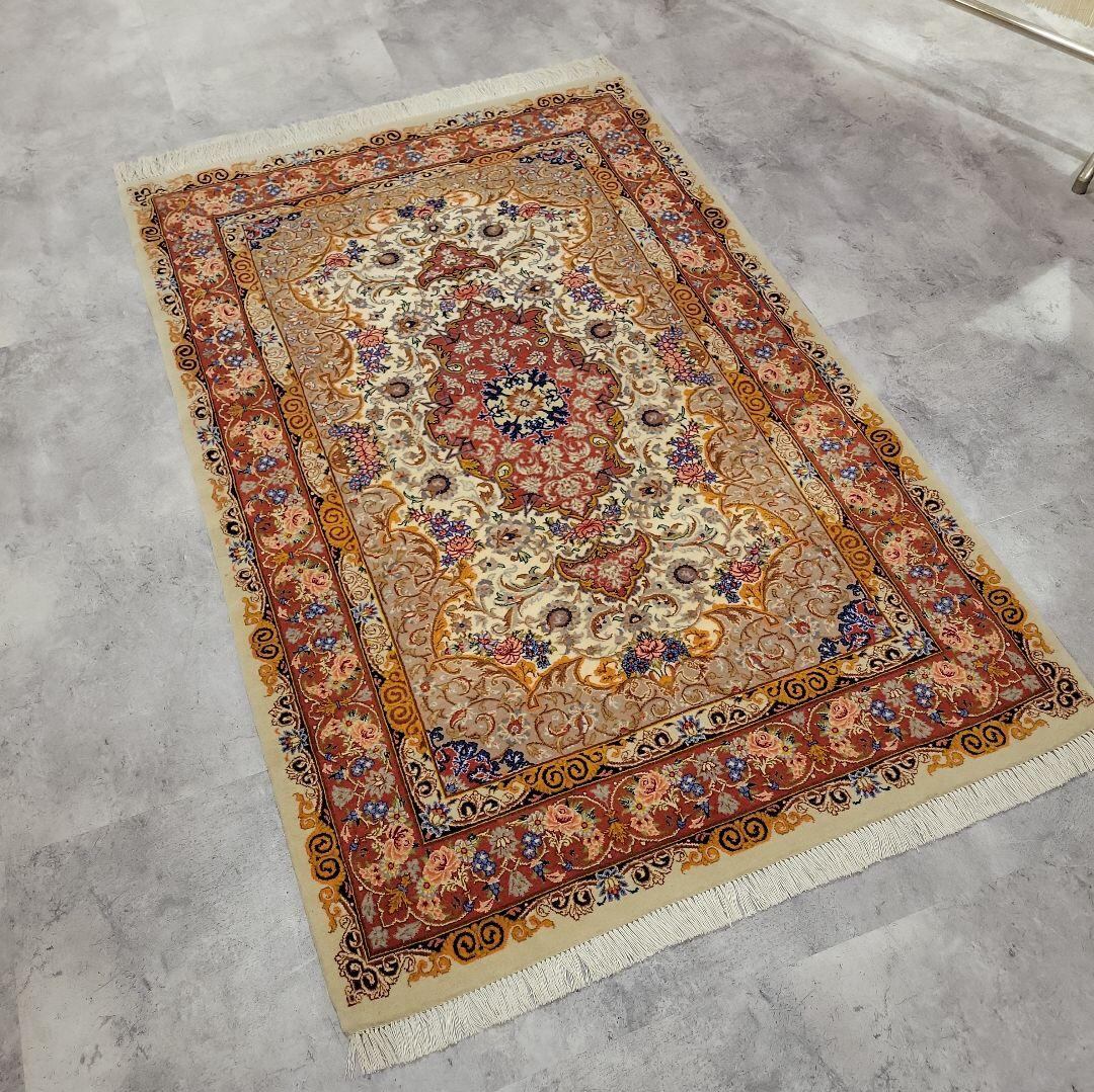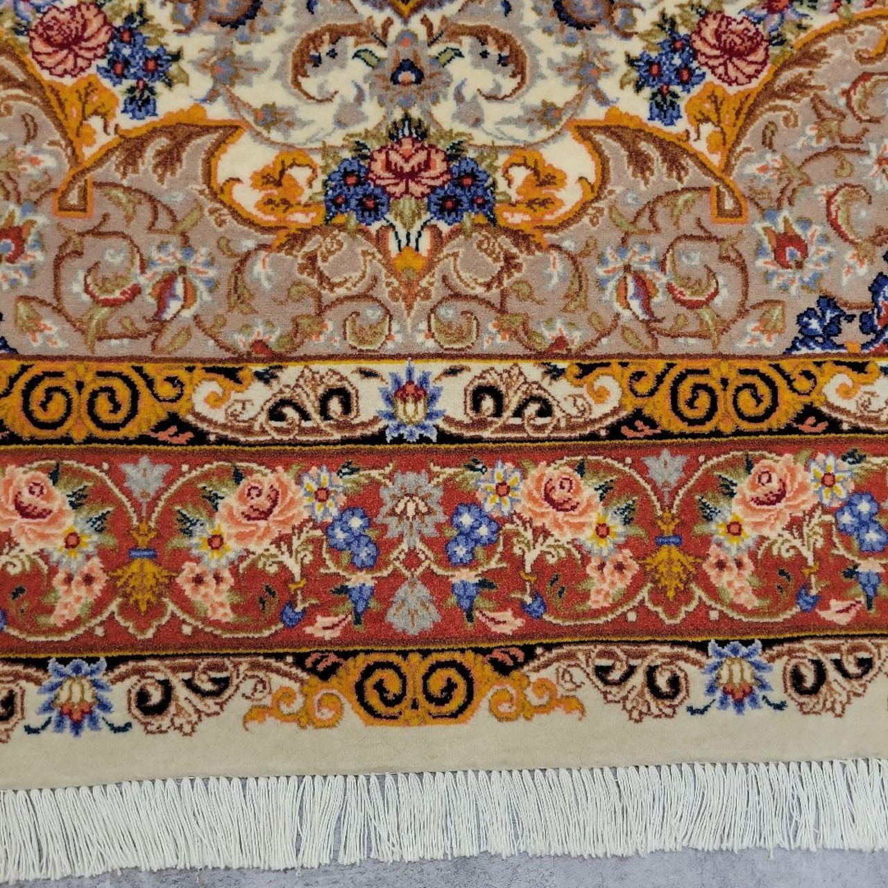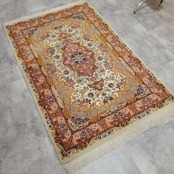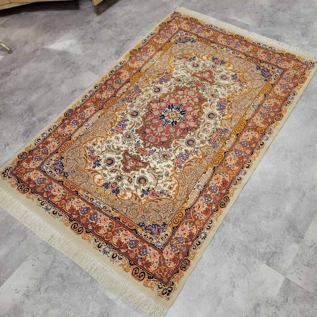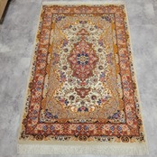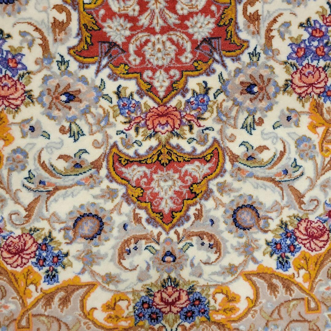 この絨毯はシルクじゅうたんで有名産地クムで作られた物ですがシルクではなくコルクウール100%で作られた数少ない物です。