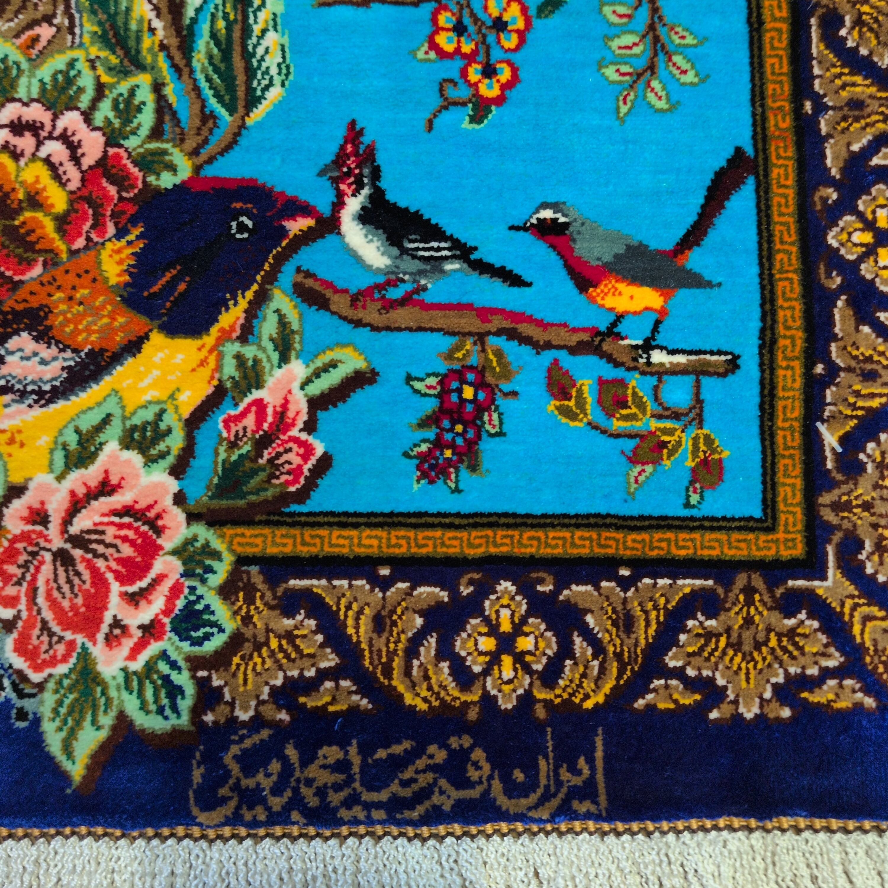 出品中のこの絨毯はシルクで有名な産地クムのミニマットマットでタペストリーとしても使えます。
