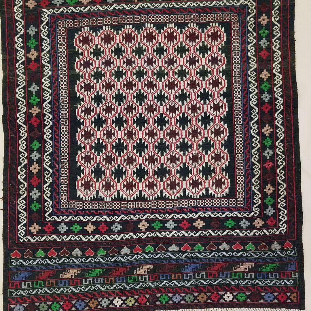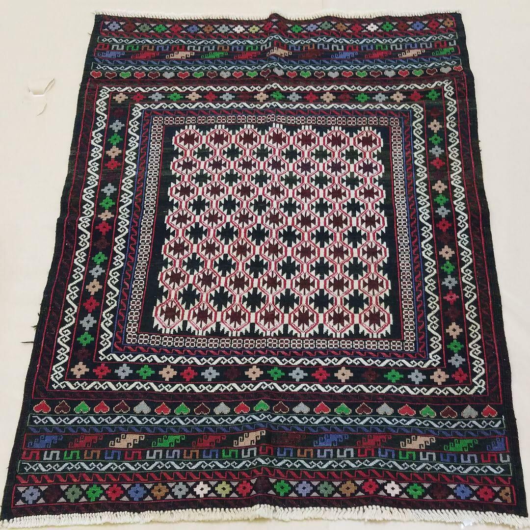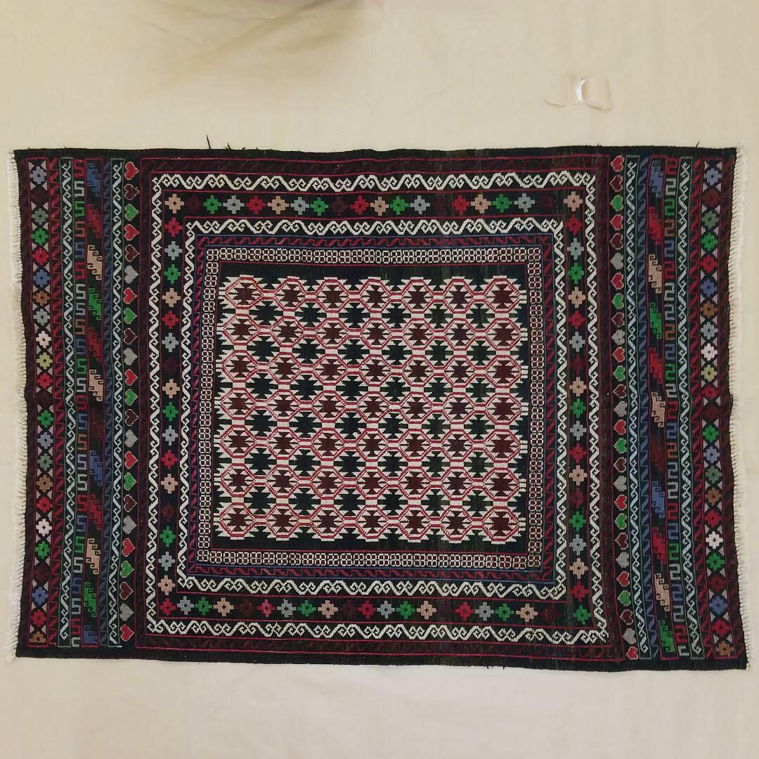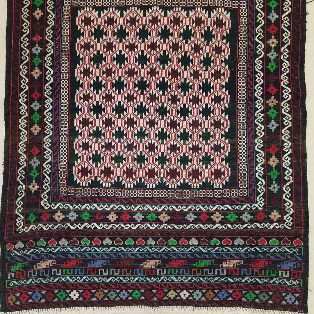 この遊牧民型キリムはイラン国内で手で織られた毛足のない敷物のことと言います。