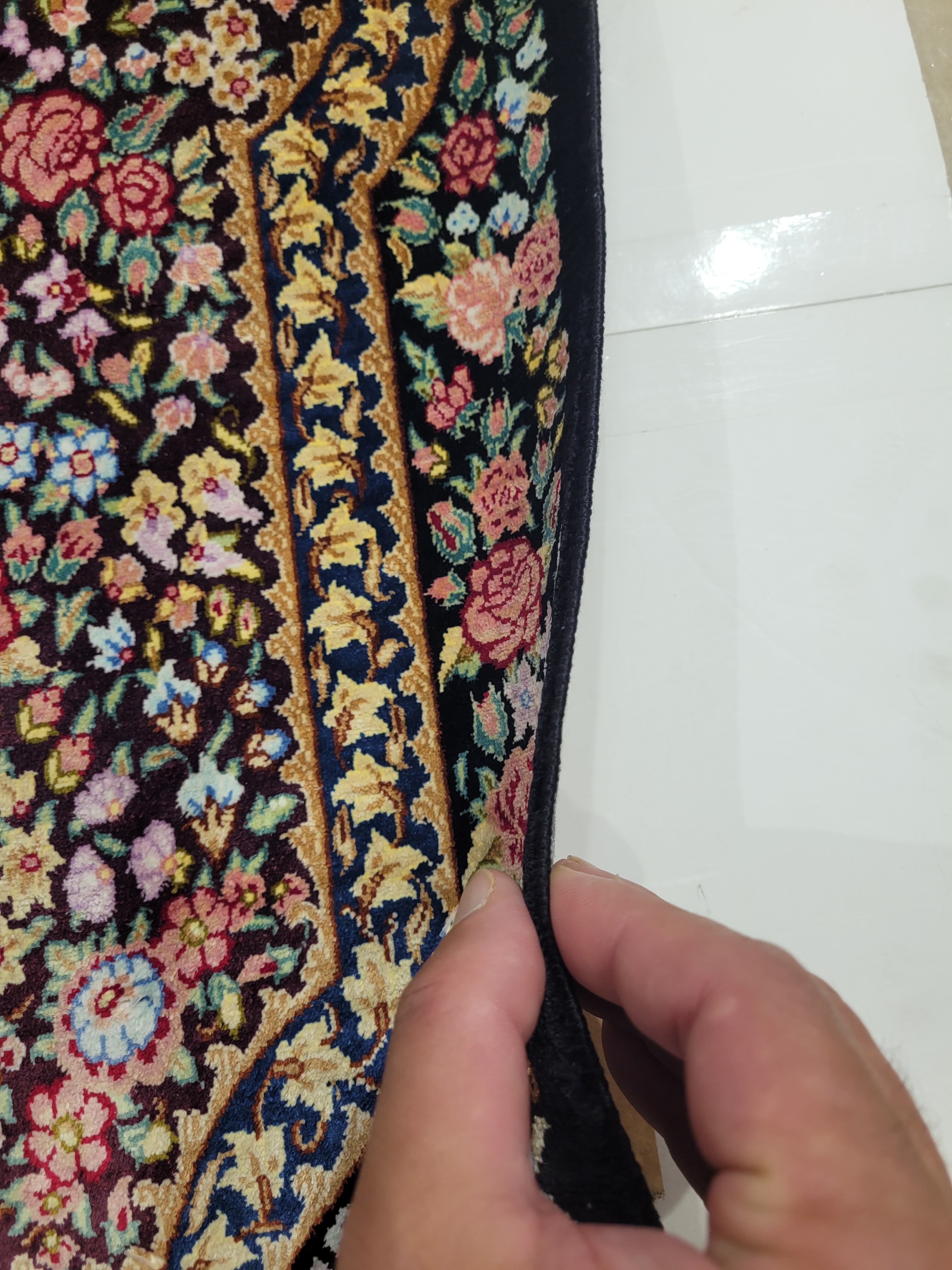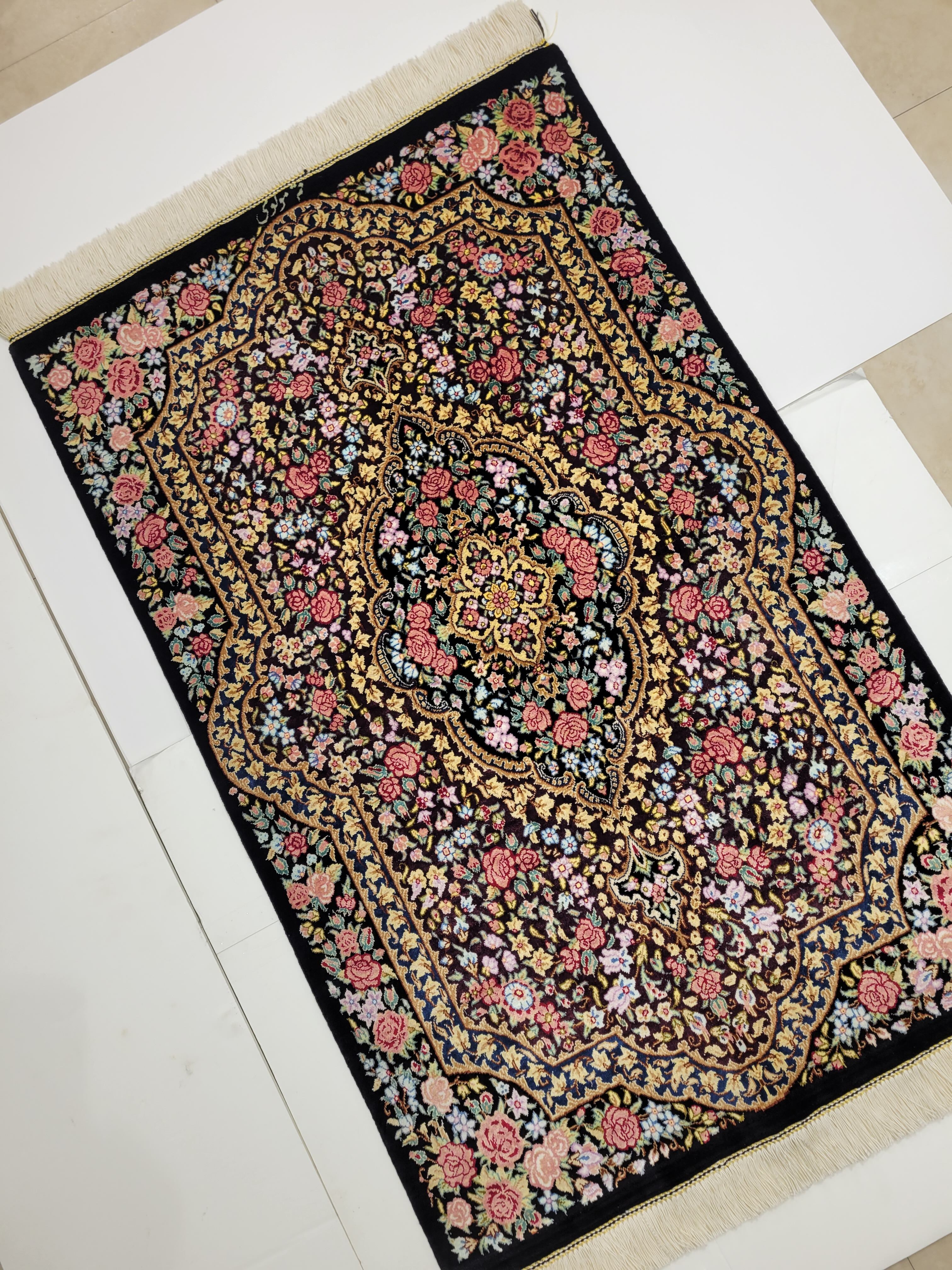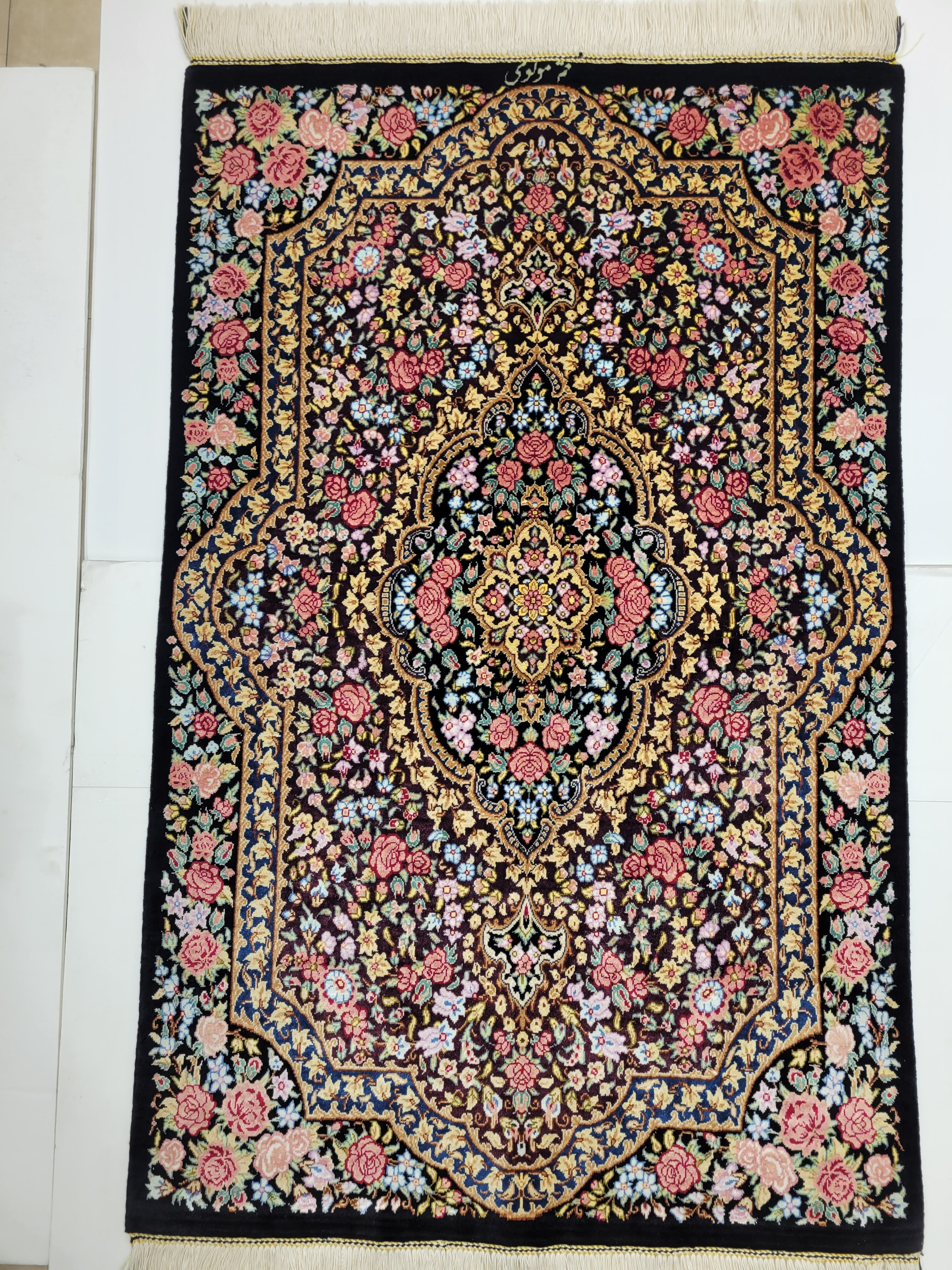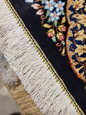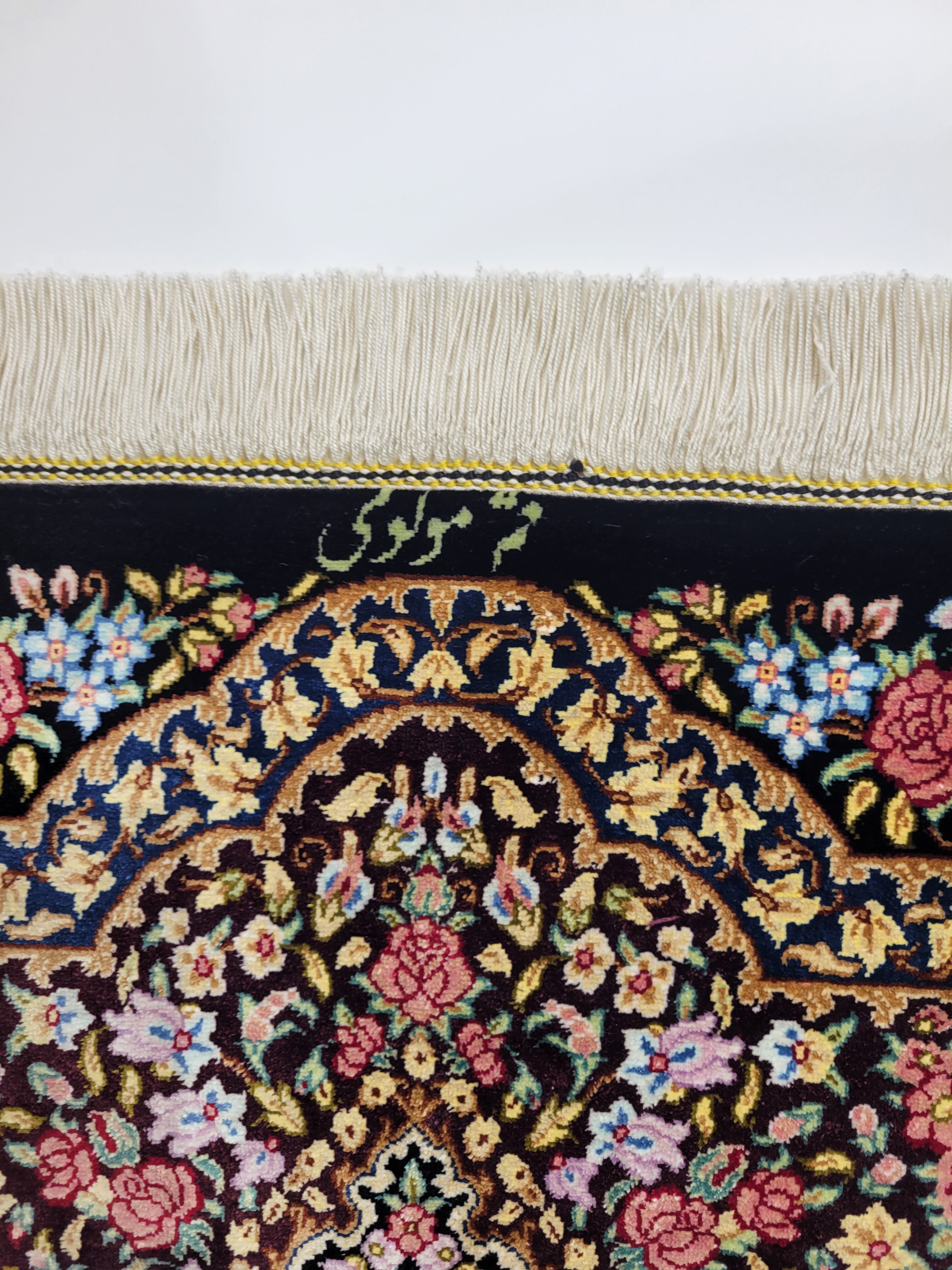 出品中のこの絨毯は シルクで有名な産地クムの中で評価が高いモロヴイ織り人の作品でサイン入りです。サインの写真あり。